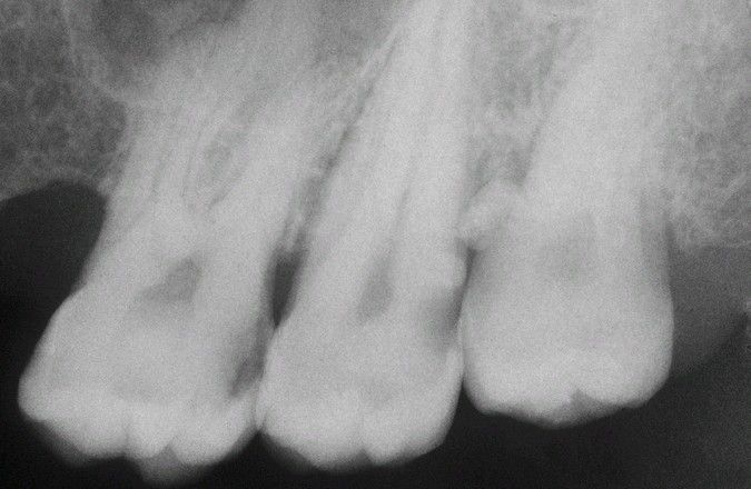 Radiopaque nodule on the mesial surface of the root of the maxillary third molar. Another less distinct enamel pearl is present on the distal root of the second molar.