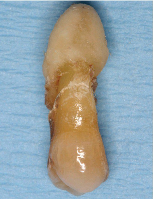 . Gross photograph of a maxillary bicuspid that exhibits thickening and blunting of the apical portion of the root.