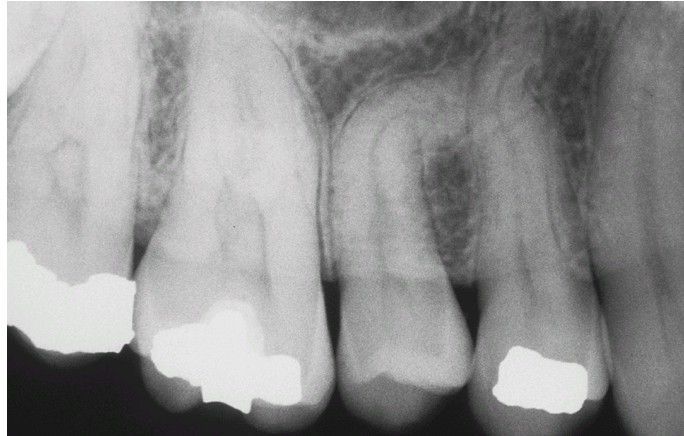 . Maxillary second bicuspid exhibiting mesial inclination of the root. The patient reported no history of injury to this area.