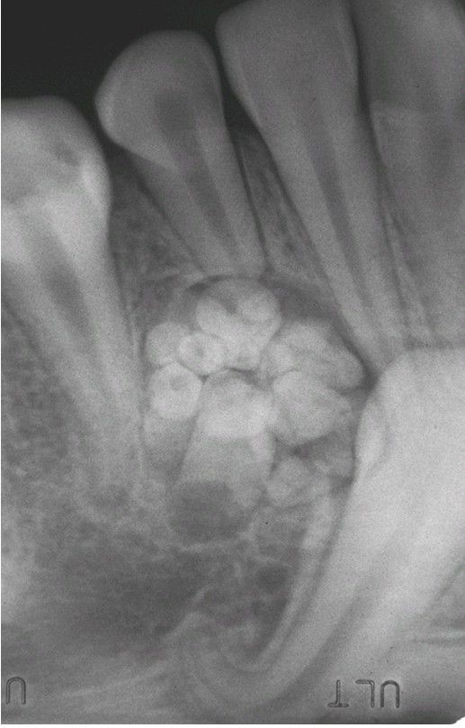 Root angulation of a mandibular cuspid. Development has been altered by the presence of an adjacent compound odontoma