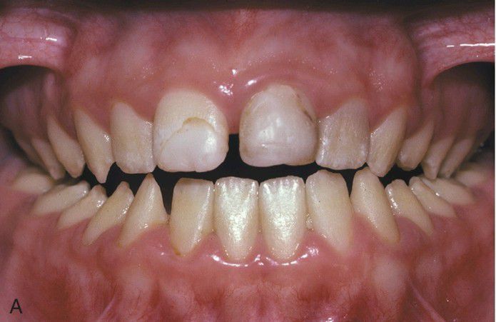Small yellowish teeth exhibiting hard, glossy enamel with numerous open contact points and anterior open bite.