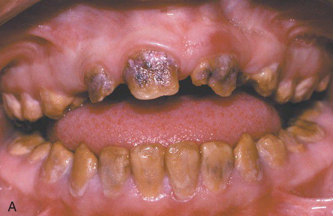 Dentition exhibiting diffuse yellow-brown discoloration. Note numerous teeth with loss of coronal enamel except for the cervical portion.