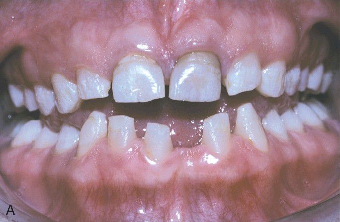 Dentition exhibiting diffuse enamel hypoplasia and hypomaturation. At birth, the patient exhibited a kinky “steel wool” texture to her hair; with time, the hair straightened. A high index of suspicion was required to arrive at the diagnosis.