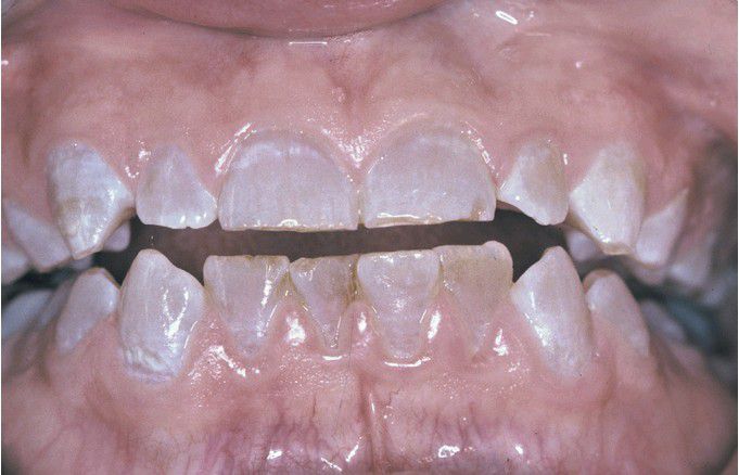 Dentition exhibiting diffuse brownish discoloration and slight translucence.