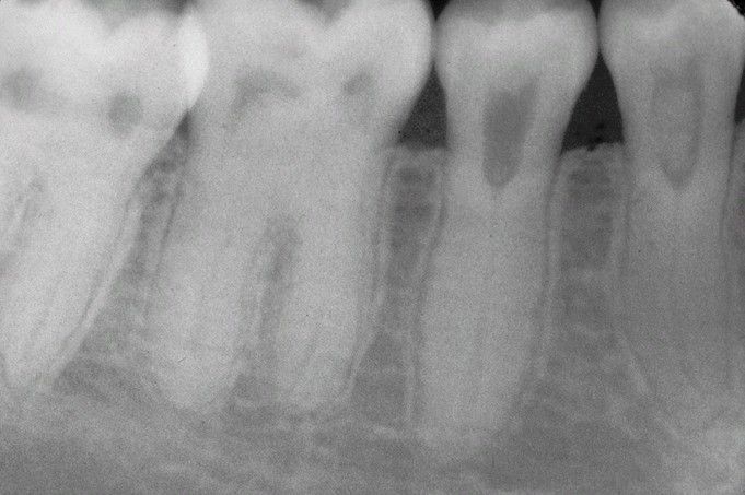 Radiographic appearance of the permanent dentition exhibiting thistle tube–shaped enlargements of the pulp chambers and numerous pulp stone