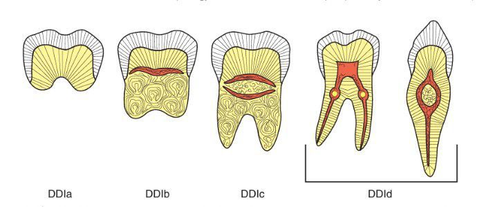 Illustration demonstrating the variability of the radiographic appearance according to the degree of dentin disorganization within the root.