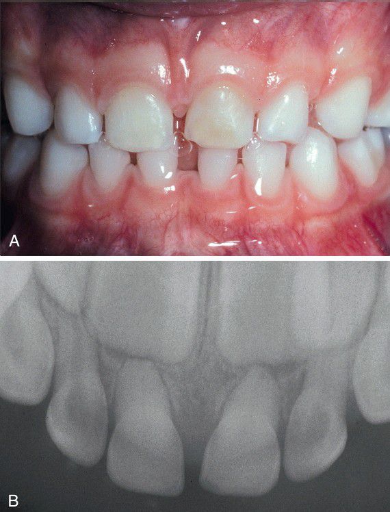 A, Left deciduous maxillary central incisor exhibiting yellow discoloration. B, Radiograph of the same patient showing total calcification of the pulp chambers and canals of the deciduous maxillary incisors.
