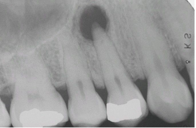 . Well-defined radiolucency associated with the apex of the maxillary first bicuspid.