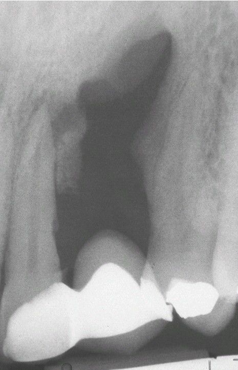 Periapical radiolucency of maxilla at the previous site of extraction in which both cortical plates were lost. The site was filled with dense collagenous tissue.