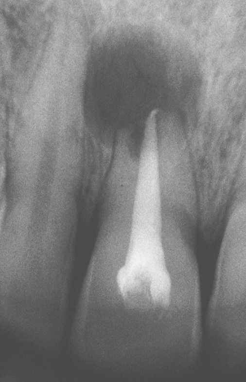 . Radiolucency associated with the maxillary central incisor, which exhibits significant root resorption.