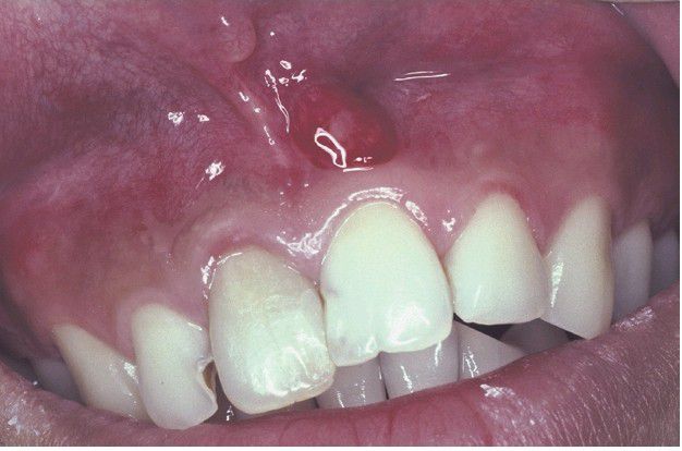 . Erythematous mass of granulation tissue overlying the left maxillary central incisor. Note discoloration of the maxillary right central incisor.