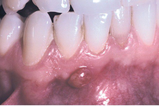 . Asymptomatic yellow-red nodule of the anterior mandibular alveolar mucosa. The adjacent teeth were asymptomatic and appeared clinically normal.