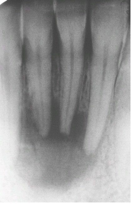 Periapical radiolucency associated with the nonvital mandibular lateral incisor.