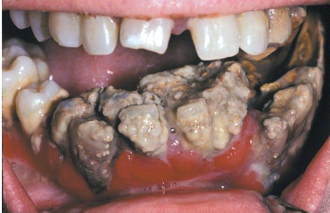 . Bright-red gingiva is blunted, receded, and hyperplastic secondary to a total lack of oral hygiene. Note the extensive calculus buildup.