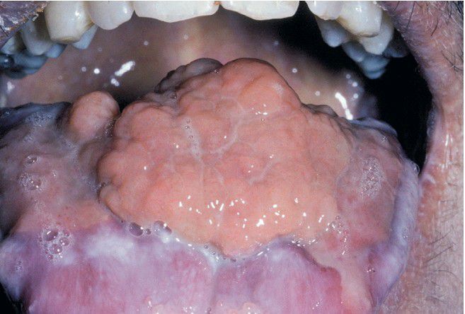 Exophytic and granulomatous-appearing mass of the dorsal surface of the tongue that arose in a bone marrow transplant patient who was receiving cyclosporine for graft-versus-host disease (GVHD).