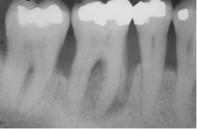 Generalized horizontal bone loss with an isolated vertical defect involving the mesial root of the first mola