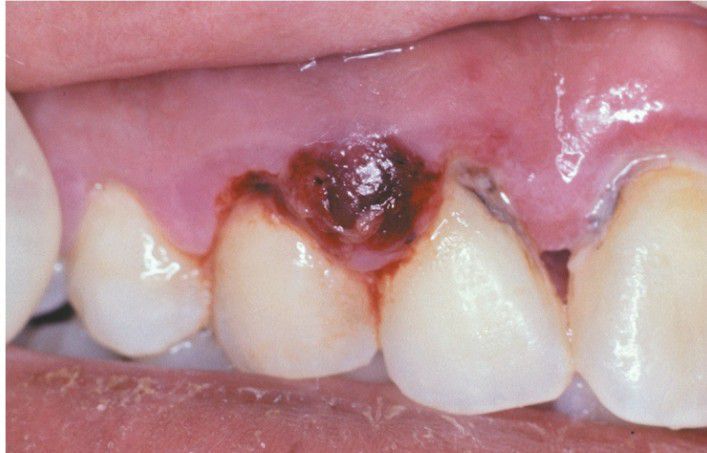 . Dark-red and hemorrhagic enlargement of the interdental papilla between the maxillary right lateral incisor and cuspid.