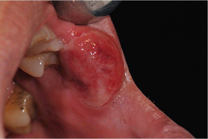 . Erythematous and ulcerated mass of the right anterior buccal mucosa