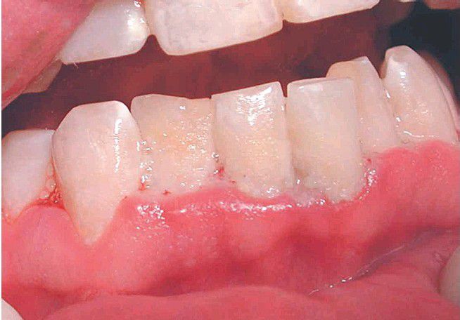 . Necrosis, purulence, and hemorrhage of the anterior mandibular gingiva