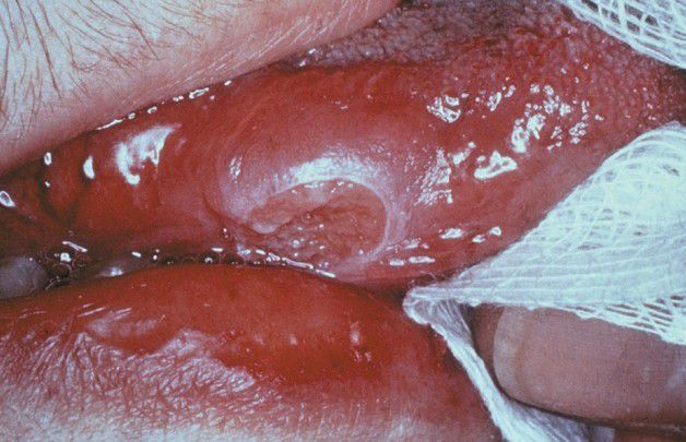 Chronic mucosal ulceration of the ventral surface of the tongue on the right side.