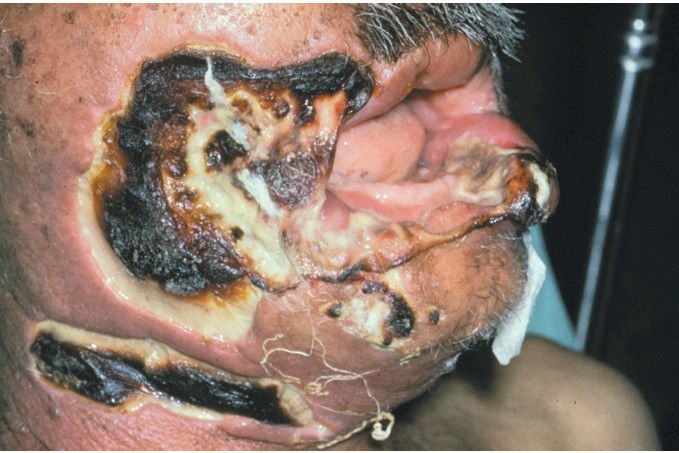 Extensive blackish orofacial necrosis of the right cheek in an immunocompromised patient.