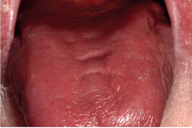 . The diffuse erythema with a smooth atrophic appearance of the dorsal tongue represents erythematous candidiasis.