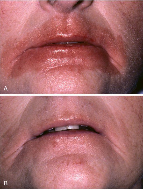 . A, Candidal infection of the perioral skin caused by use of a petrolatum-based product. The condition started as angular cheilitis, but the patient continuously applied petroleum jelly to the corners of the mouth and perioral skin, sealing moisture into the keratin layer of the epidermis, thereby allowing the candidal organisms to thrive. B, Two weeks after discontinuing the petroleum jelly and using topical iodoquinol with triamcinolone.