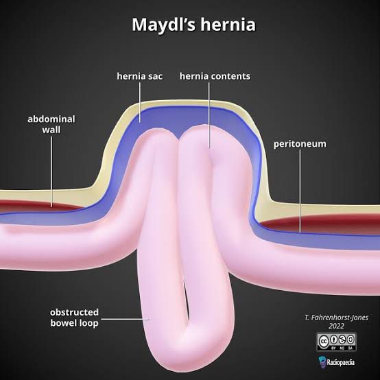 Maydl hernias (alternative plural: herniae) are defined as the presence of two small bowel loops within a single hernial sac, that is, there are two efferent and two afferent loops of bowel, forming a "W" shape. Hence sometimes known as a W hernia or a hernia-in-W.