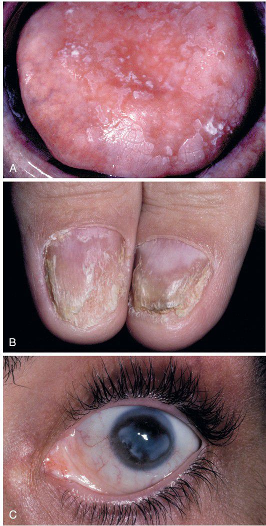 A, Erythematous candidiasis diffusely involving the dorsal tongue of a 32-year-old man. B, Same patient showing nail dystrophy. C, Corneal keratopathy is also noted. Patient had a history of the onset of hypoparathyroidism and hypoadrenocorticism, which were both diagnosed in the second decade of life.