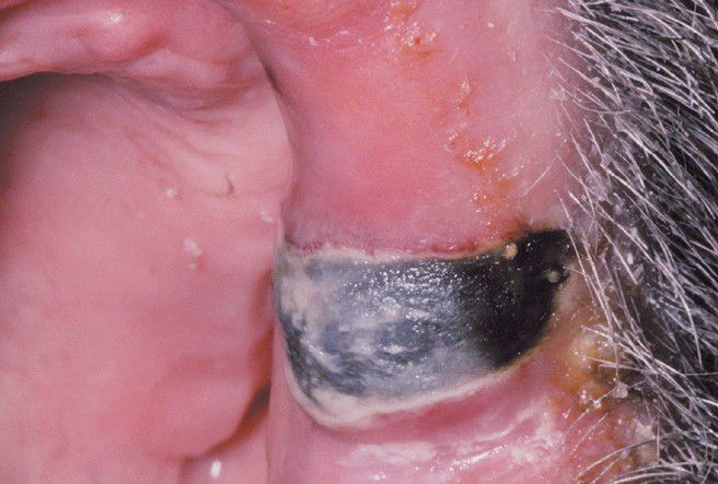 . This necrotic lesion of the upper lip developed in a man with uncontrolled type I diabetes mellitus. Biopsy and culture showed a rare example of invasive oral infection by Candida albicans.