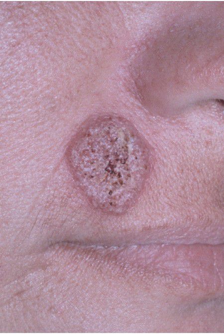 . This granular erythematous plaque of cutaneous blastomycosis has affected the facial skin.