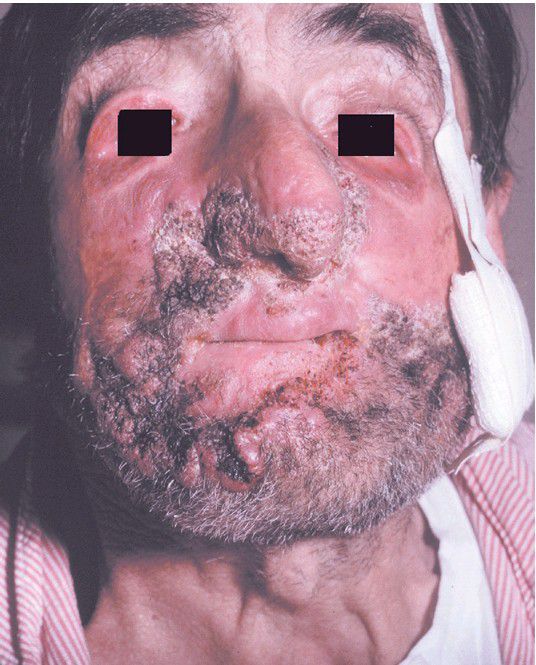 Severe cutaneous infection by Blastomyces dermatitidis.