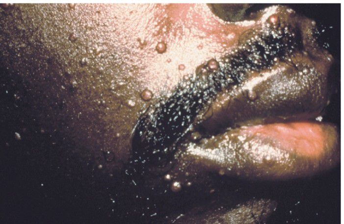 . These papules of the facial skin represent disseminated cryptococcal infection in a patient infected with human immunodeficiency virus (HIV).