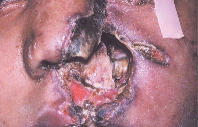 . Diffuse tissue destruction involving the nasal and maxillary structures caused by a Mucor species