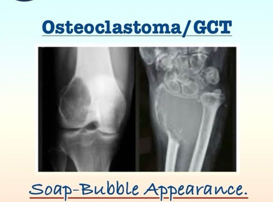 The giant cell tumor of bone (GCTB), also known as an osteoclastoma or a myeloid sarcoma, is a benign local aggressive osteolytic neoplasm that primarily affects skeletally mature young adults. These usually arise in the metaphysis and extend into the epiphysis of long bones.