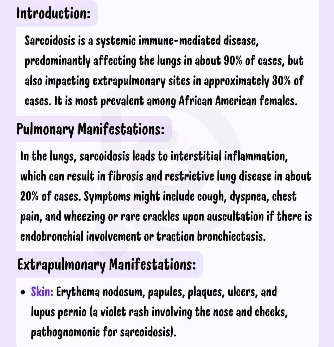 Sarcoidosis is a condition that causes lumps or nodules (granulomas) to form in your lungs, lymph nodes, skin, eyes and other parts of your body. Symptoms include cough, shortness of breath, tender sores on your shins, eye pain and redness.