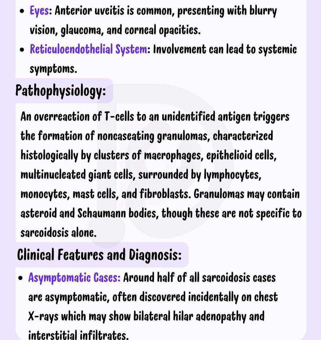 Sarcoidosis is a condition that causes lumps or nodules (granulomas) to form in your lungs, lymph nodes, skin, eyes and other parts of your body. Symptoms include cough, shortness of breath, tender sores on your shins, eye pain and redness.