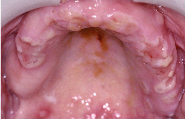 . Numerous shallow herpetic erosions with raised, yellow and circinate borders on the maxillary alveolar ridge in an immunocompromised patient.