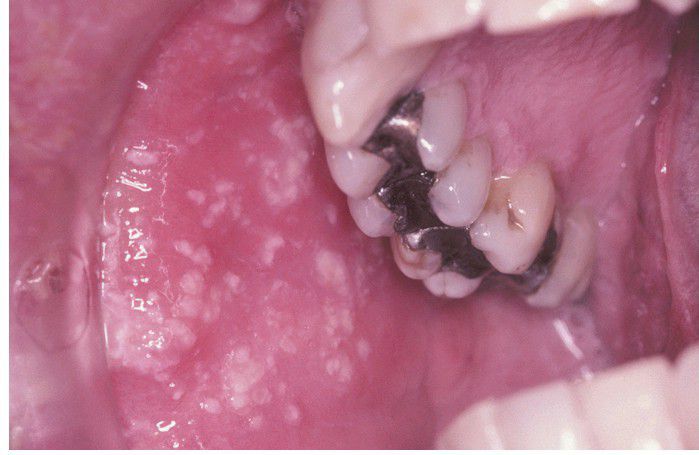. Numerous white opaque vesicles on the right buccal mucosa.