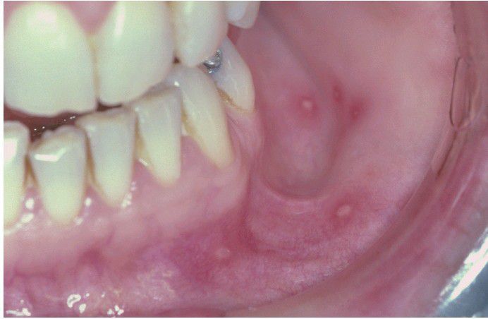Multiple aphthous-like ulcerations of the mucobuccal fold.