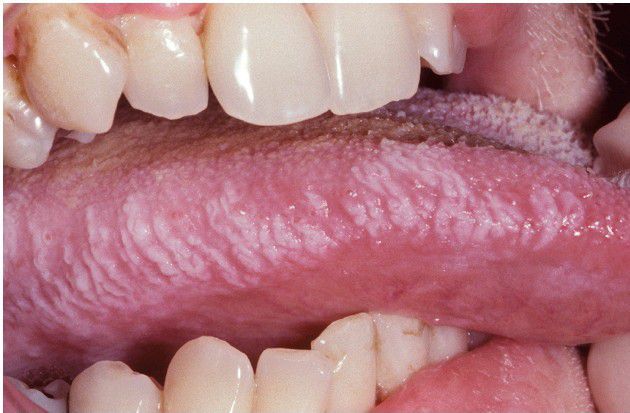 Vertical streaks of keratin along the lateral border of the tongue.