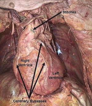 Coronary artery by-pass surgery is used to provide circulation to the heart when one or more of the coronary arteries becomes occluded. In this case, three separate grafts were stitched to the ascending aorta to provide adequate circulation to the ventricular walls.