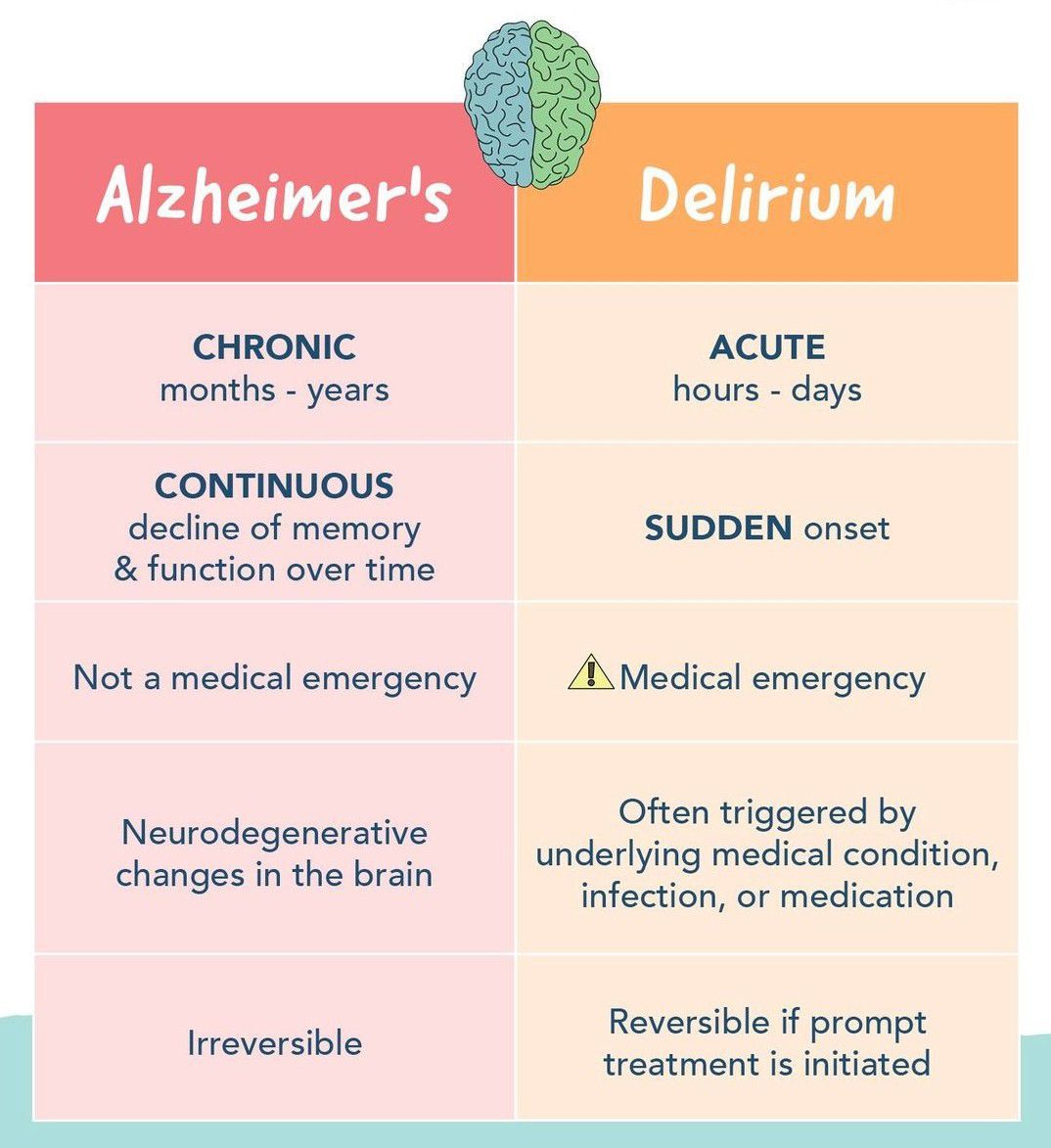 Here is a brief comparison of Alzheimer's and delirium.