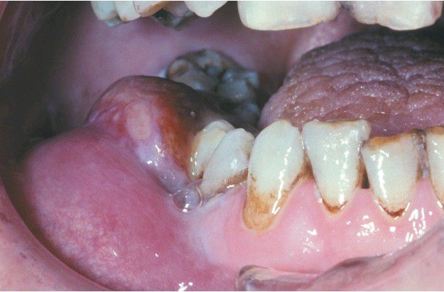 Erythematous and ulcerated soft tissue enlargement of the posterior mandibular gingiva and mucobuccal fold on the right side.