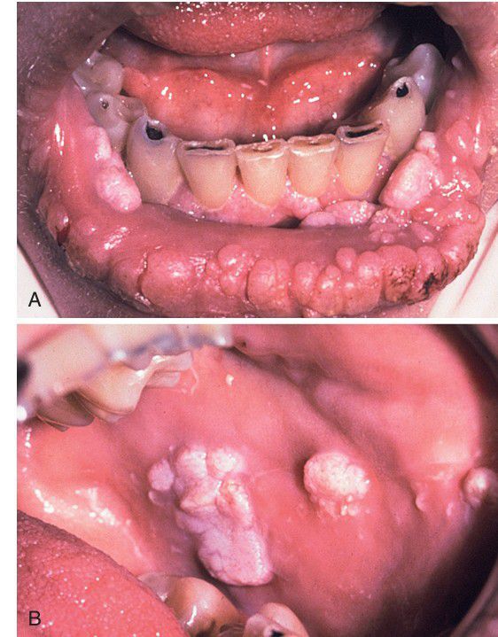 Multiple exophytic and somewhat papillary nodules of the lip, buccal mucosa, and gingiva.