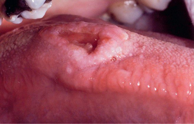 . Indurated ulceration with a rolled border on the dorsal surface of the tongue on the right side.