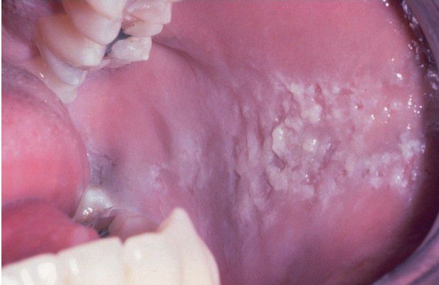 Thickened, shredded areas of white hyperkeratosis of the left buccal mucosa.