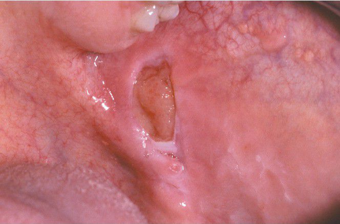 Well-circumscribed ulceration of the posterior buccal mucosa on the left side