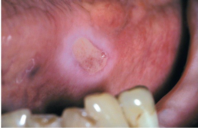 Mucosal ulceration with a hyperkeratotic collar located on the ventral surface of the tongue.