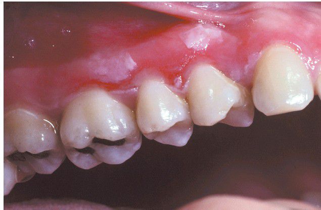 Extensive epithelial necrosis of the anterior maxillary gingiva secondary to interproximal placement of hydrogen peroxide with cotton swabs.